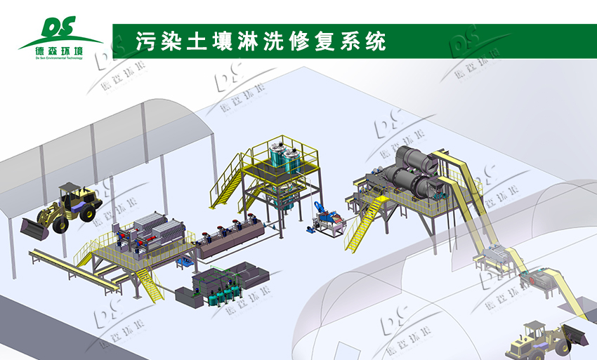 整套土壤淋洗修复包括:初级破碎筛分系统;淋洗分级系统;脱水筛分系统;反浮选系统;水处理系统等。